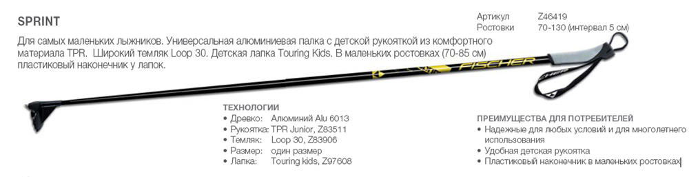 Для самых маленьких лыжников. Универсальная алюминиевая палка с детской рукояткой из комфортного материала TPR. Широкий темляк Loop 30. Детская лапка Touring Kids. В маленьких ростовках (70-85 см) пластиковый наконечник у лапок.